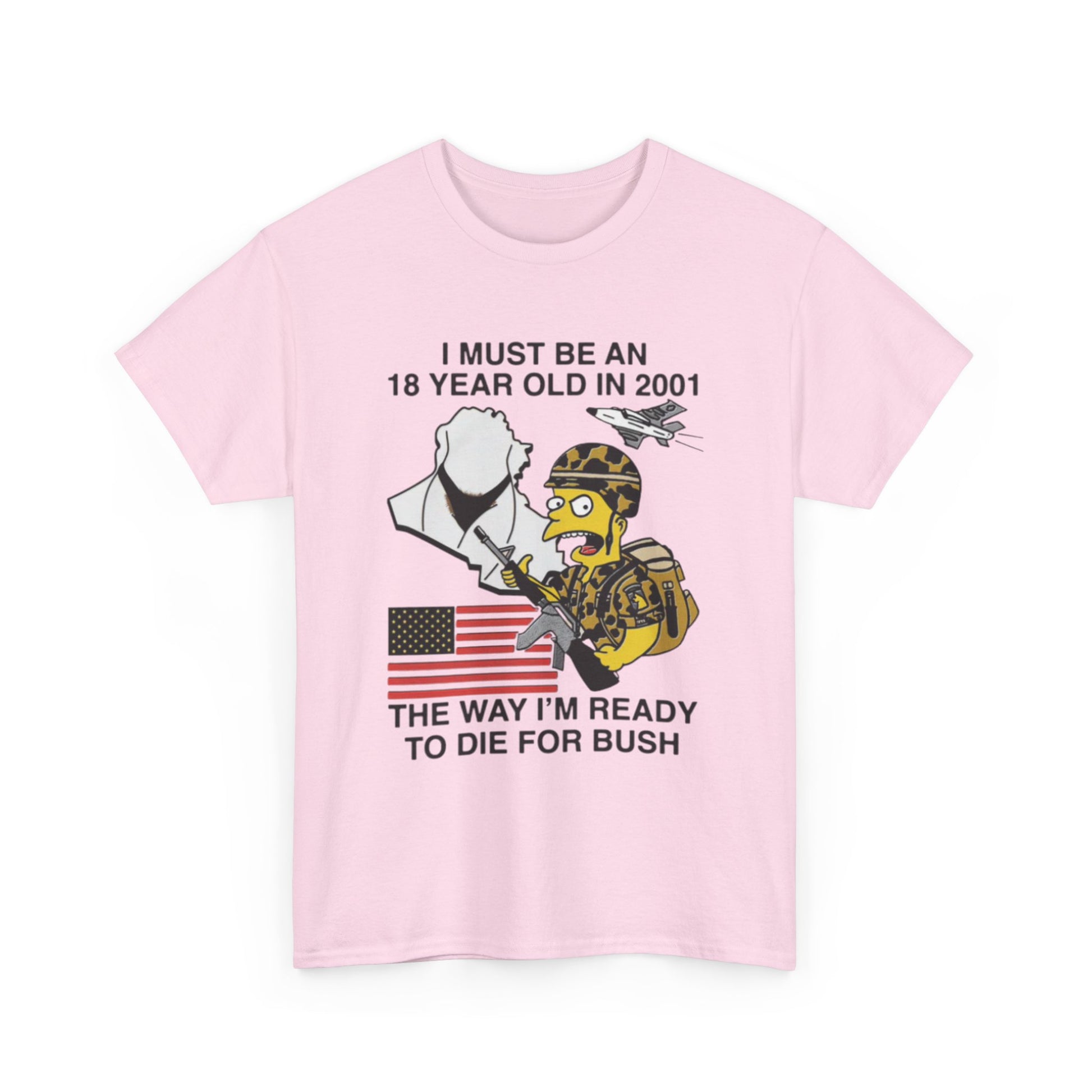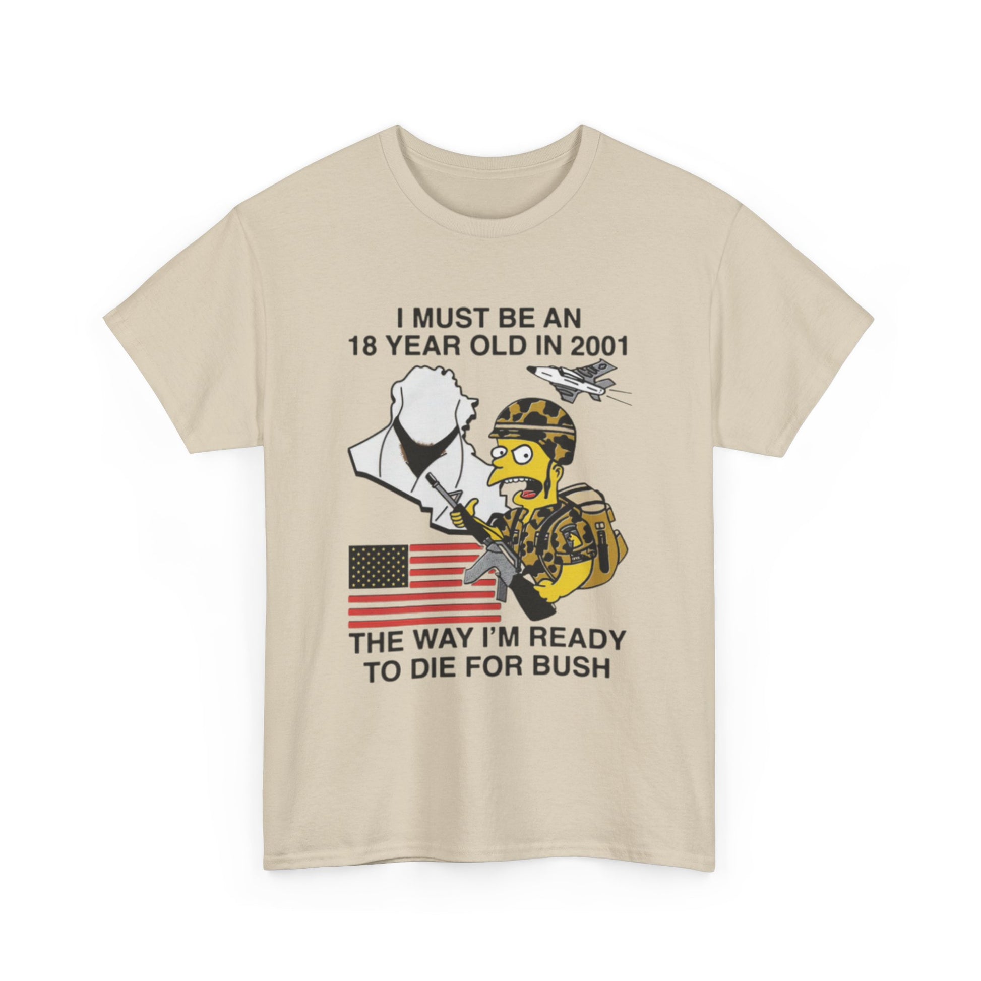 This classic cotton tee carries a bold, tongue-in-cheek design that speaks to a very specific slice of patriotic, veteran-supporting culture. The front artwork combines a stylized, helmeted soldier figure, an American flag, and a short declarative slogan that references coming of age in 2001 and a readiness to serve. The shirt’s relaxed crew-neck cut and durable 100% cotton body make it comfortable for all-day wear — whether layered under a jacket at a rally, worn to a casual meetup with like-minded friends, or kept as part of a nostalgic wardrobe. The print uses a mix of high-detail DTF for sleeves and inner labels and DTG for main areas, keeping lines crisp and colors true against the natural white base. This shirt feels worn-in and straightforward — direct in message and built to last.